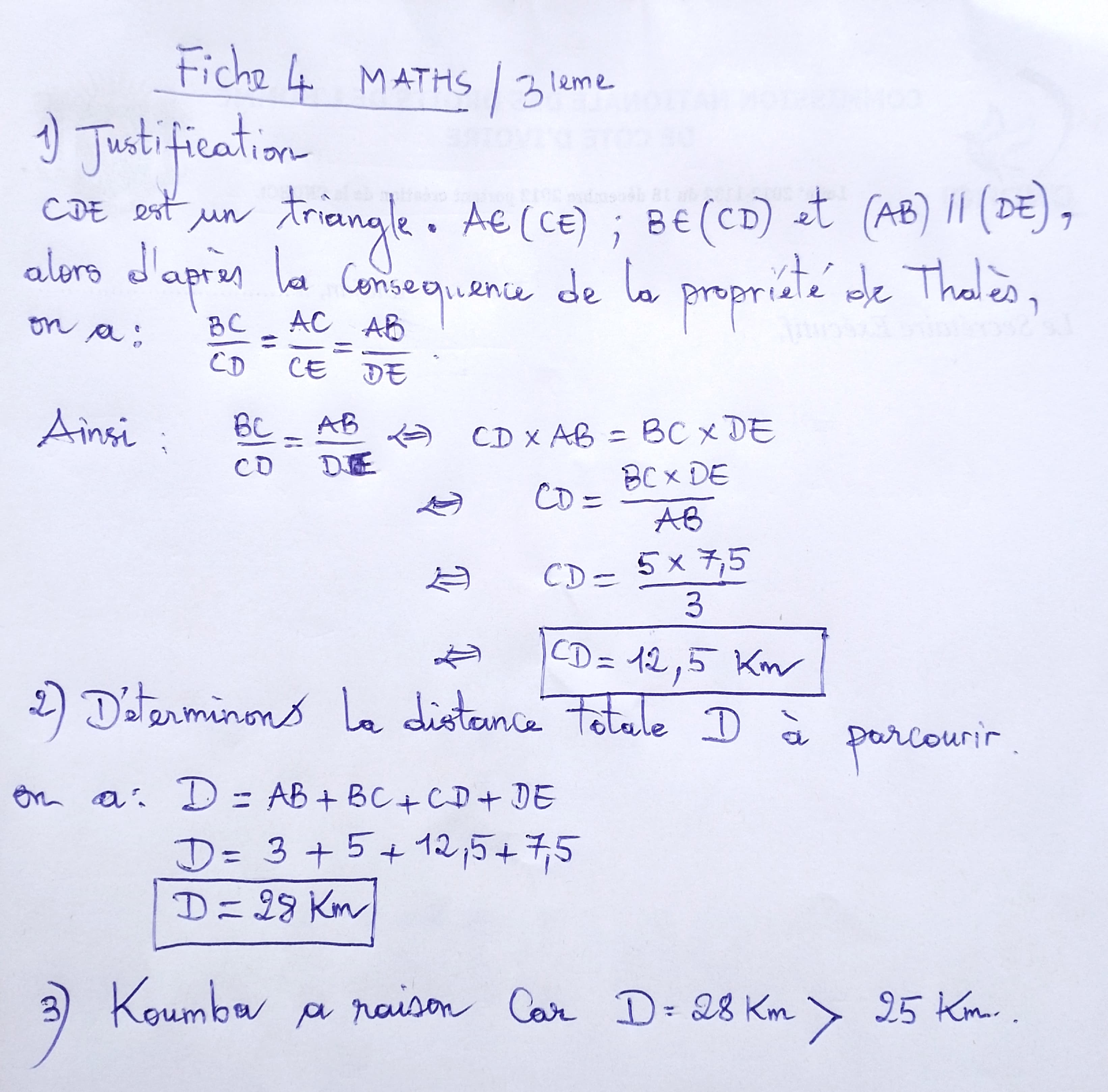 MATHS 3ième : FICHE 4 (PROPRIETES DE THALES DANS LE TRIANGLE) : CORRECTION DISPONIBLE